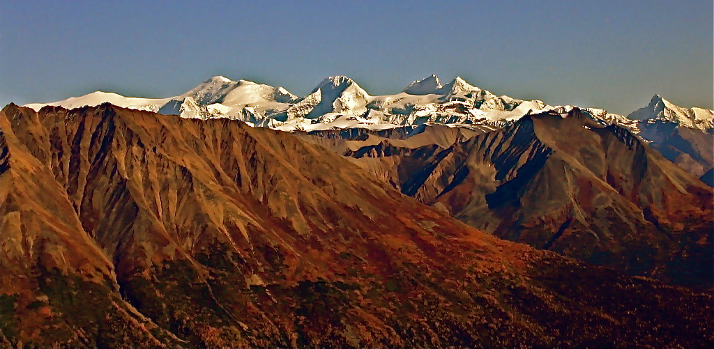 ALASKA RANGER takes you into the Alaskan Interior, a largely pristine region of immense mountains, huge, glacier-scoured valleys, endless, rolling tundra, and almost no towns or inhabitants at all. The trip is highlighted by a 3-night stop at Alaska’s first and most popular national park: Denali, in the heart of the Alaska Range. With its ages-old food chain still intact from bottom to top, this huge park teems with readily view-able mega-fauna and other wildlife like no other region of the North American continent. Grizzlies, wolves, moose, caribou, and Dall mountain sheep, along with many smaller mammals, as well as more than 200 species of birds are all abundant. And above this Vermont-sized wilderness park towers mighty Denali itself (also known as Mt. McKinley), the continent’s largest (20,320′) and most spectacular massif.